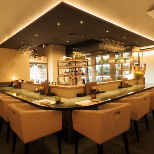 カウンター席はお仕事帰りのお食事や、気軽に飲みたいときにぴったり。間隔が広くゆったりした造りなので、落ち着いた空間でお食事やお酒を愉しんでいただけます。